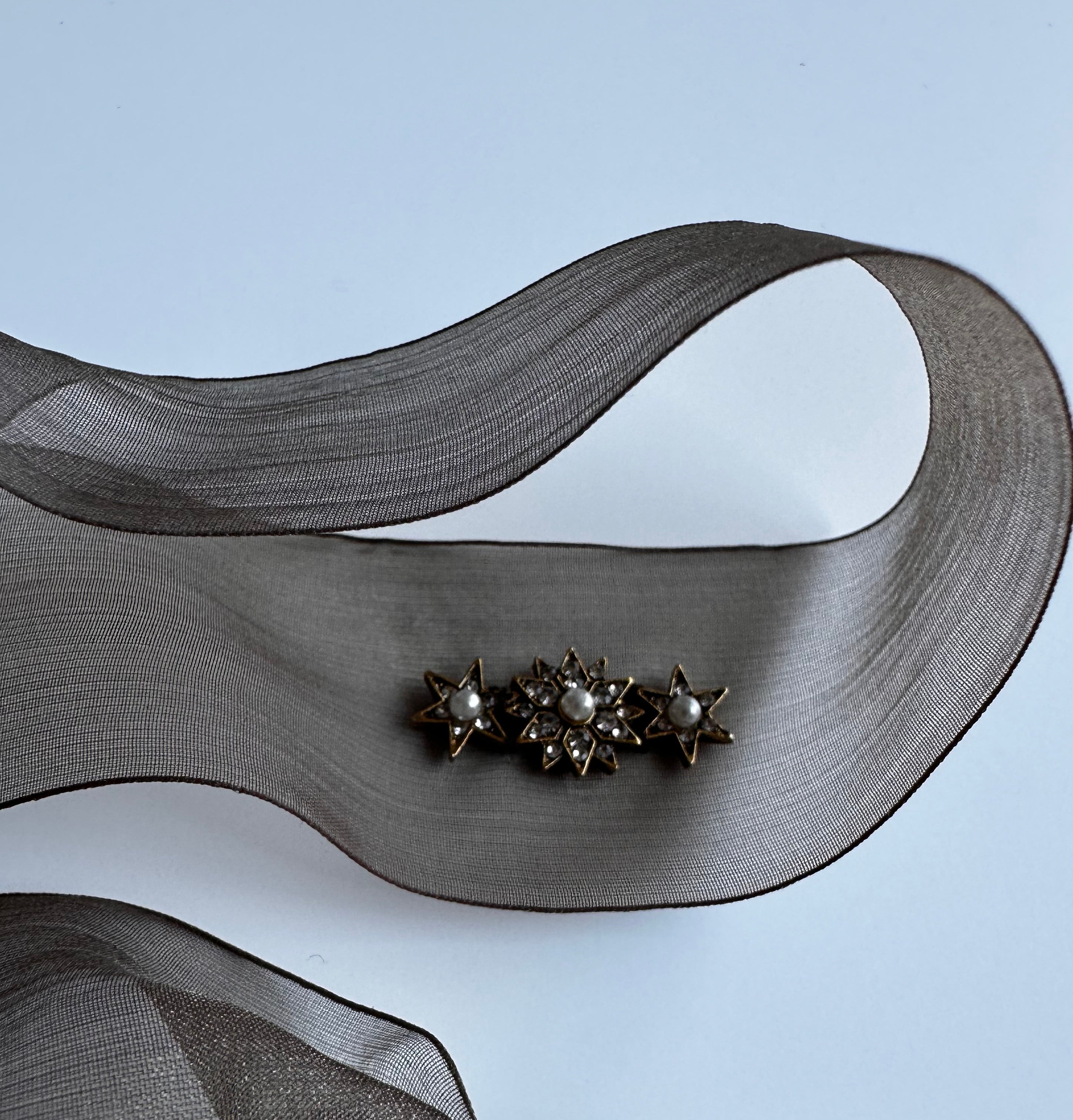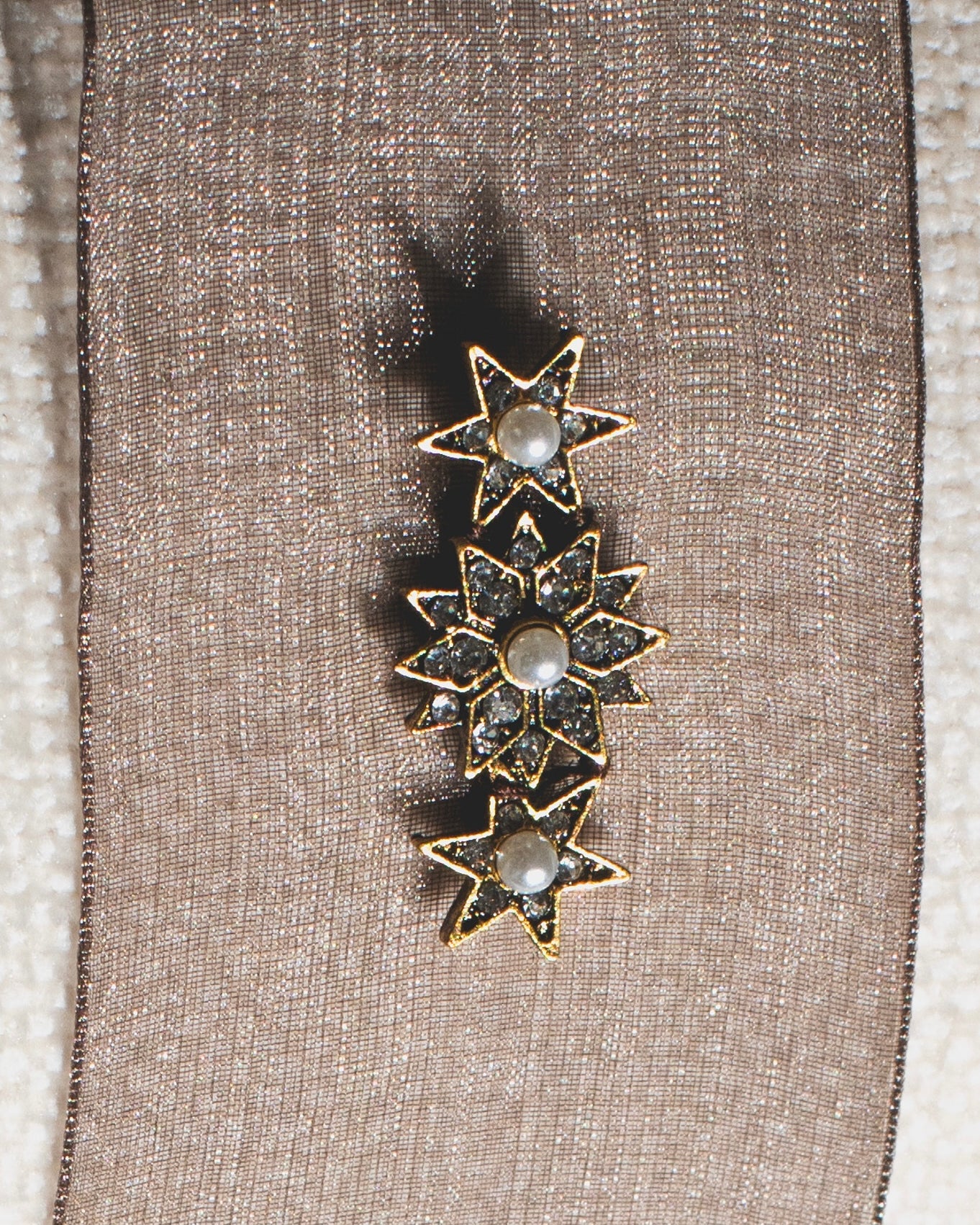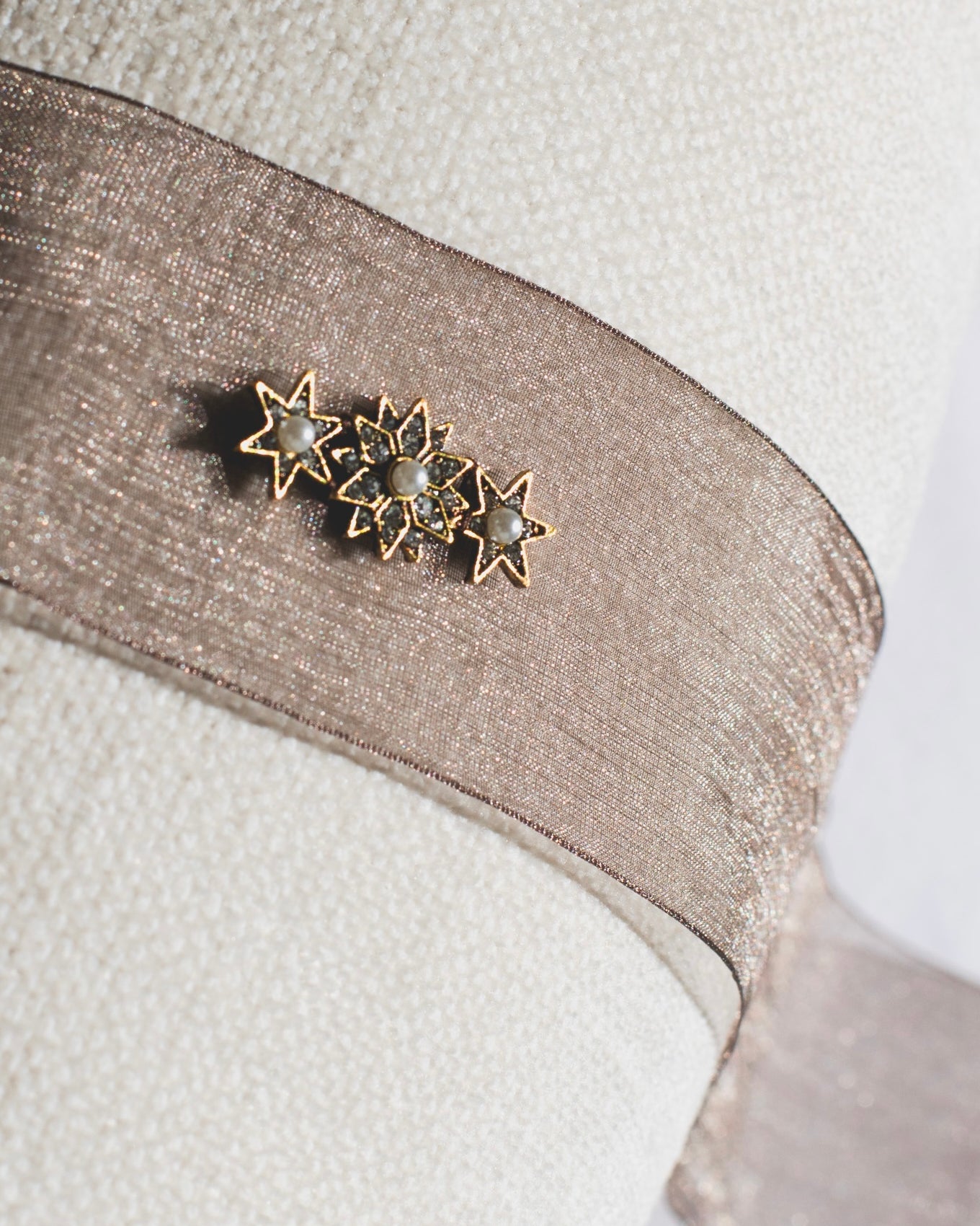 Choker confeccionado en tela de raso marrón, con un cierre dorado en ambas puntas y una estrella de estilo vintage cosida en el centro.