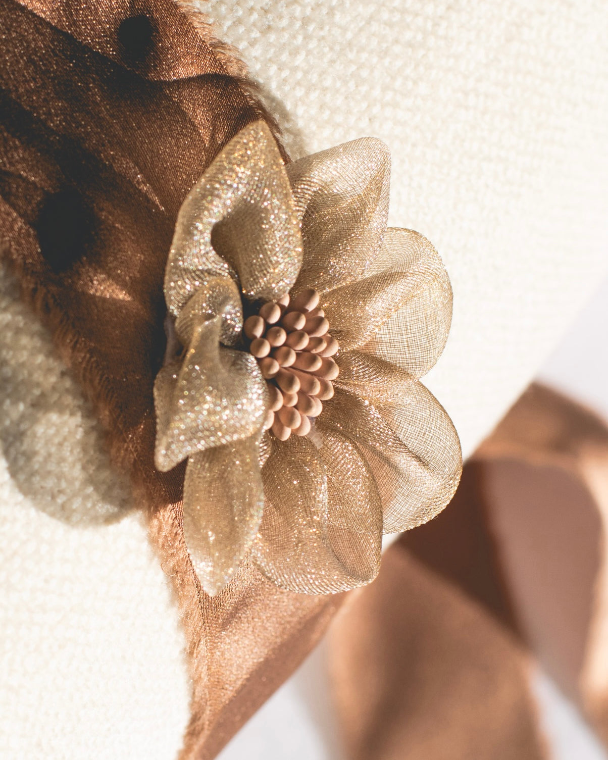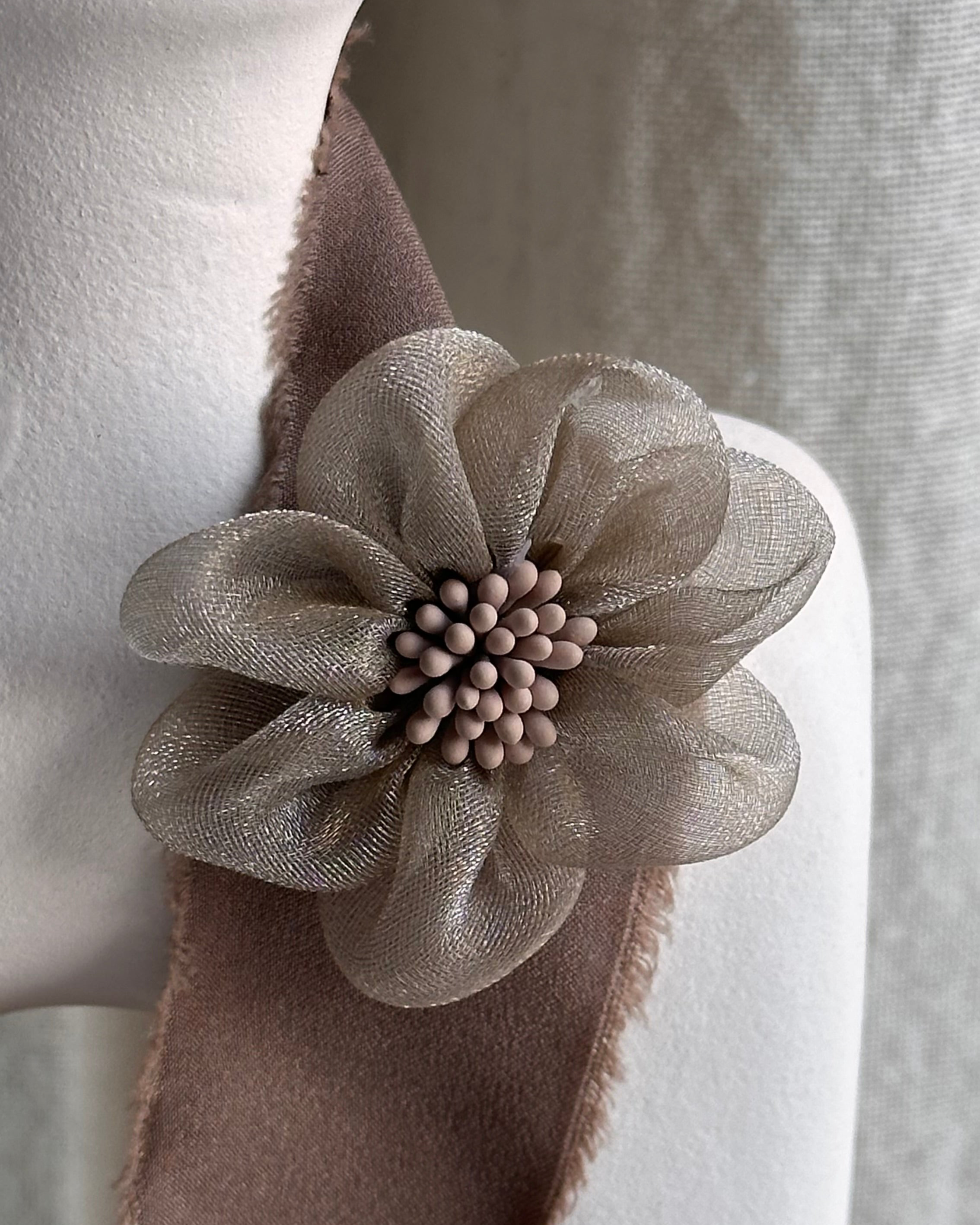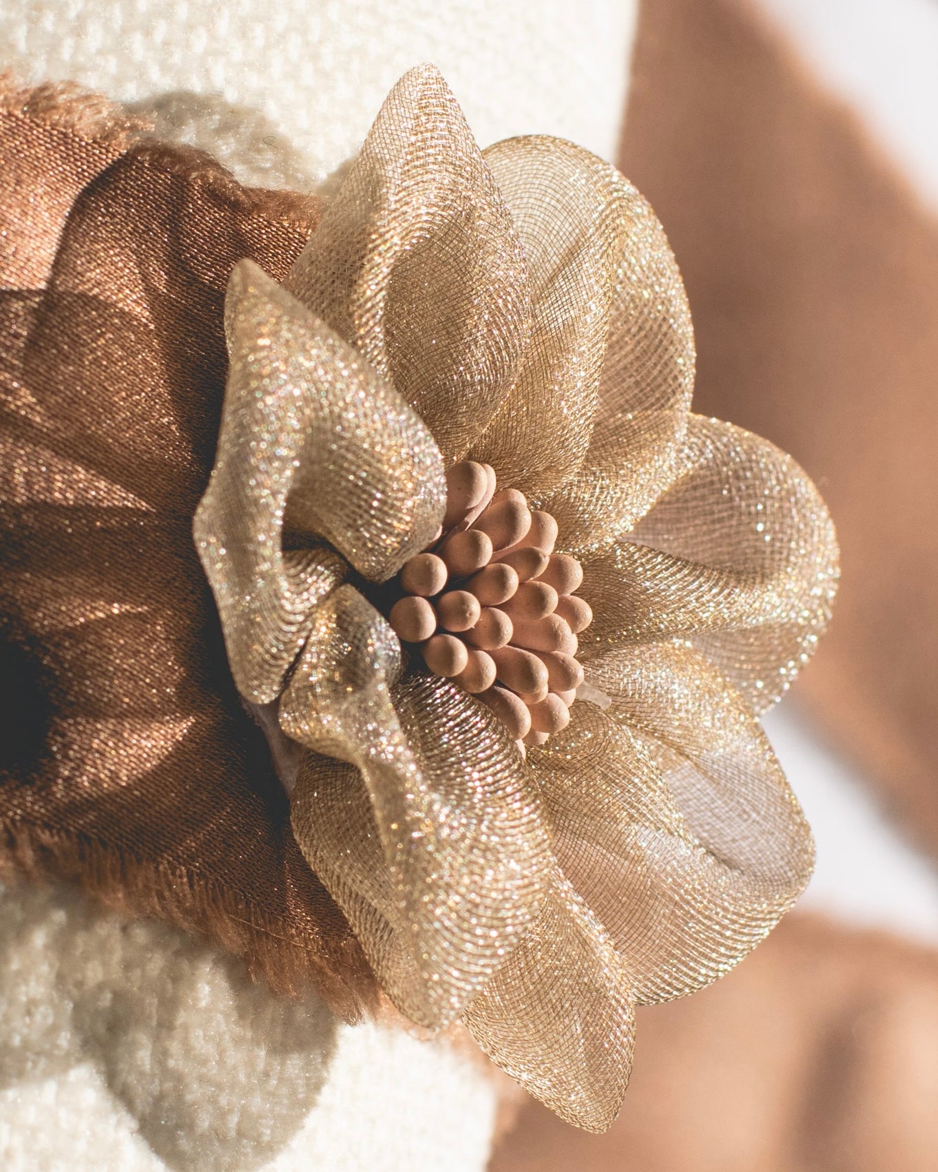 Choker confeccionado en tela de raso marrón, con un cierre dorado en ambas puntas y una estrella de estilo vintage cosida en el centro.