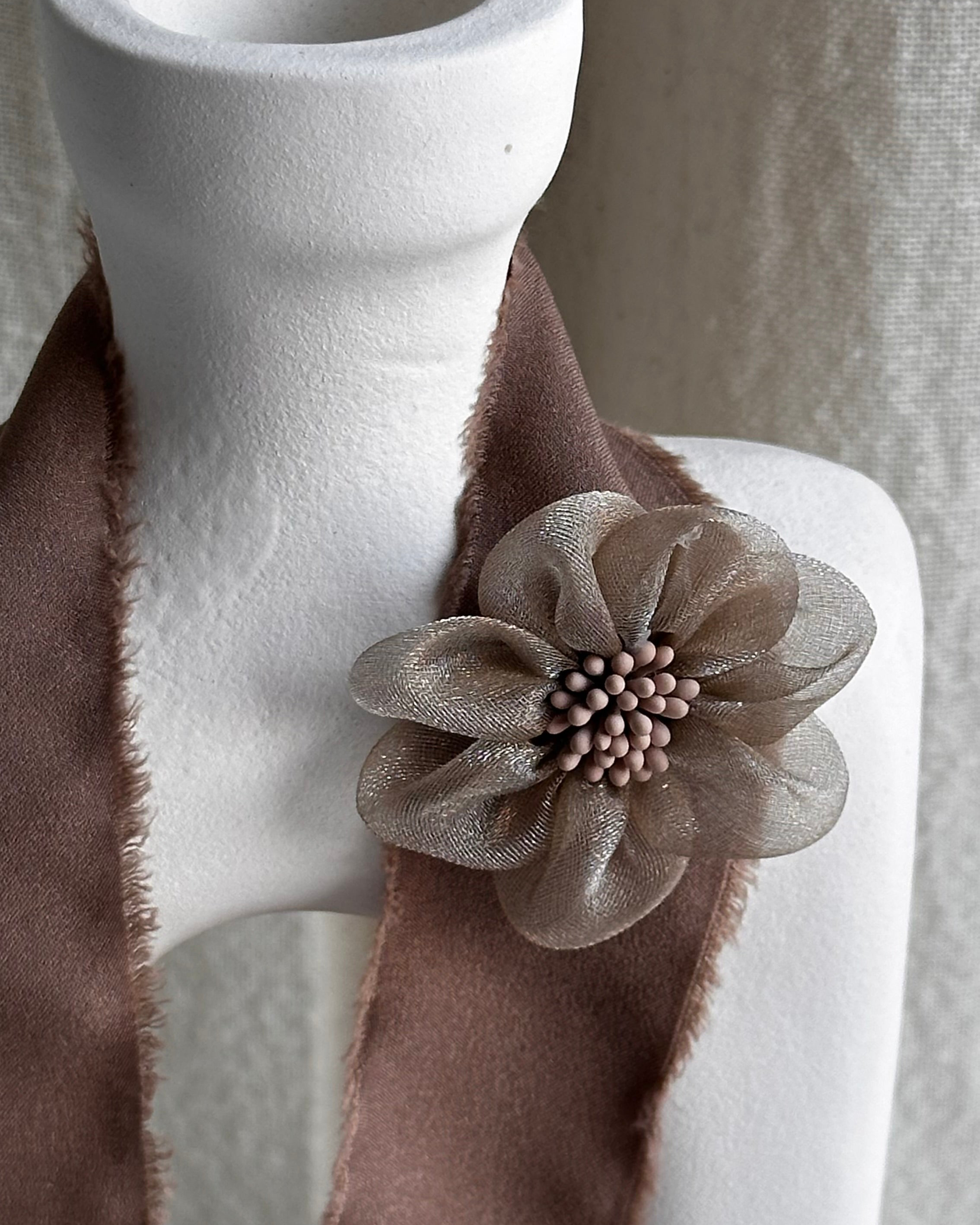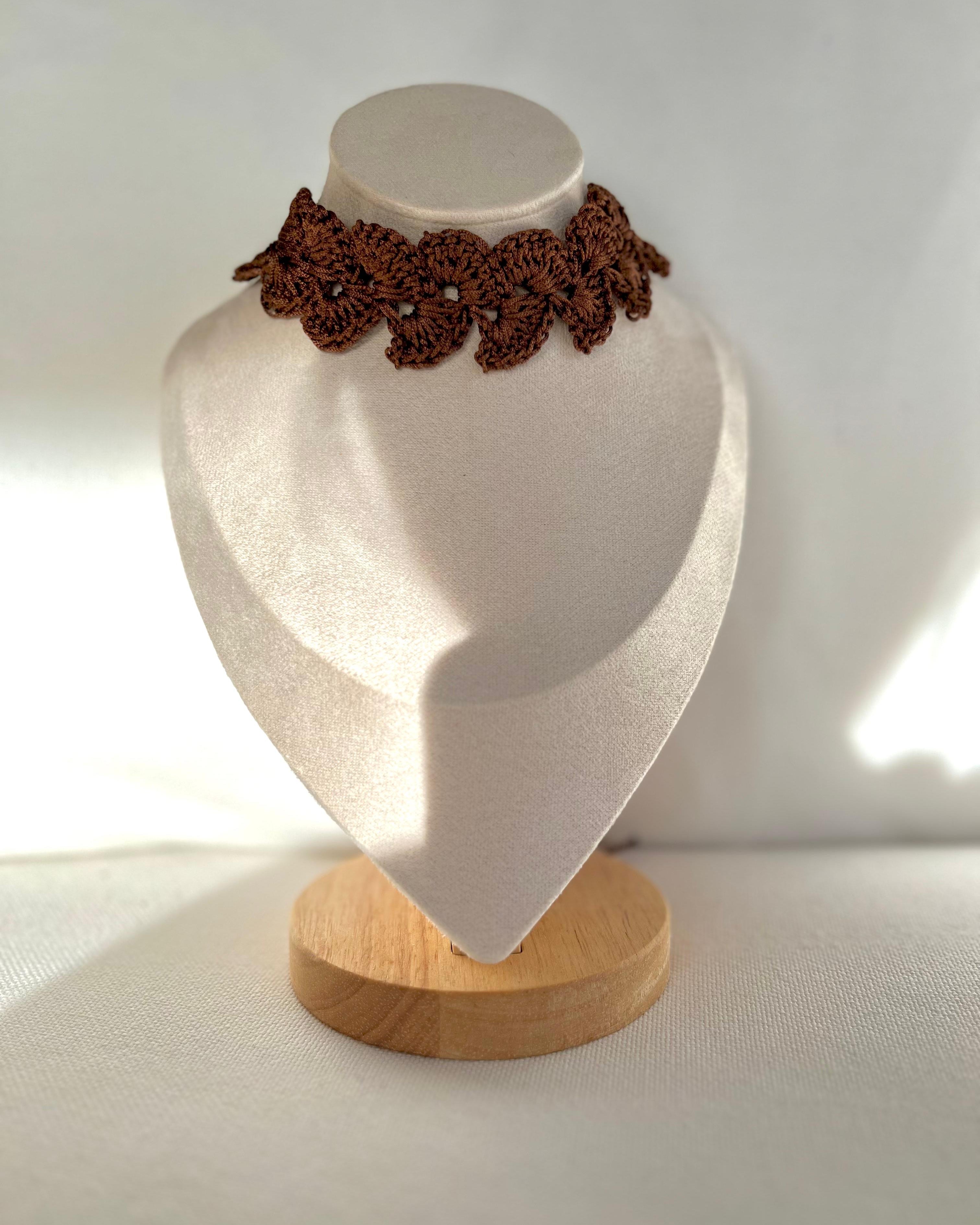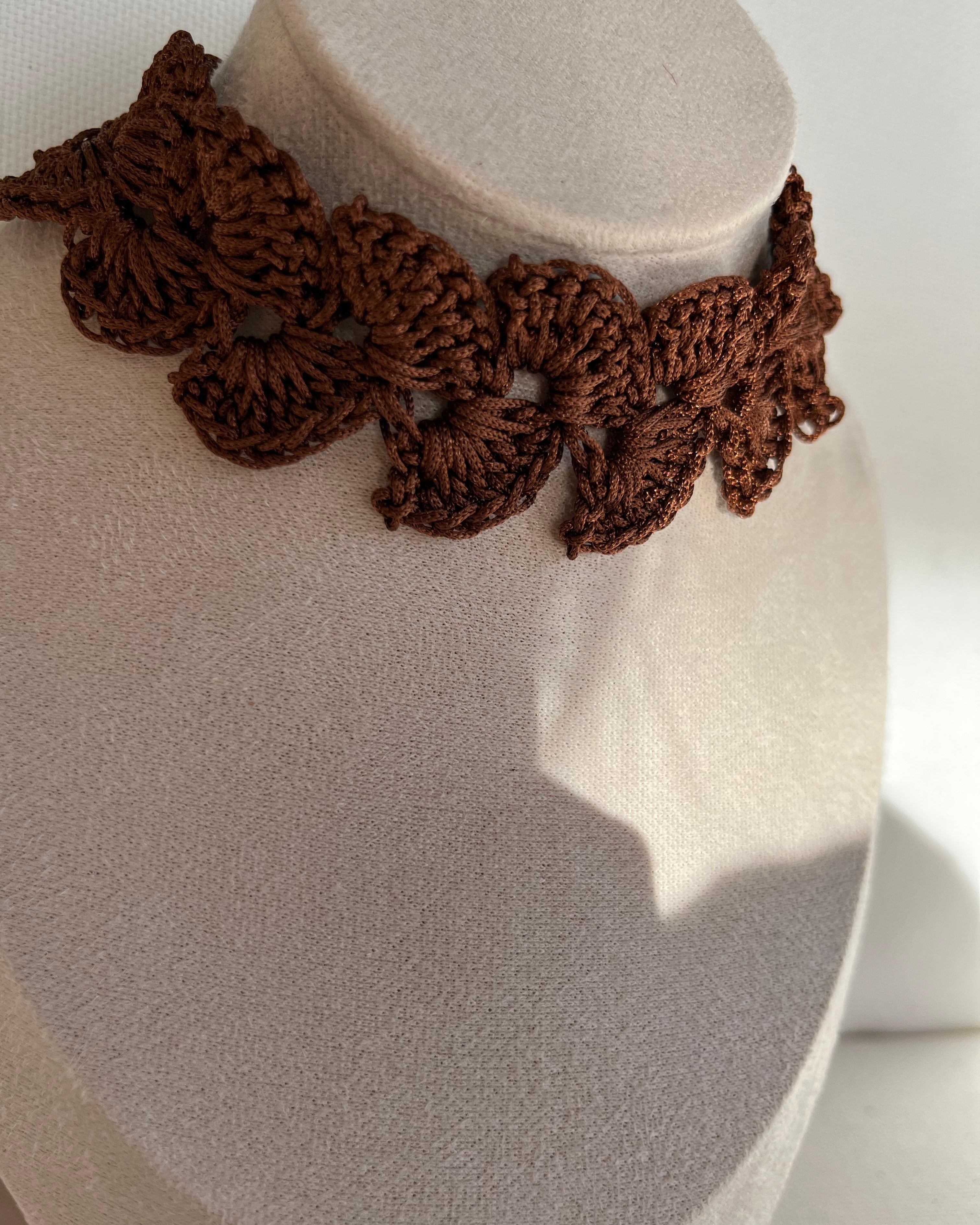 Choker confeccionado en tela de raso marrón, con un cierre dorado en ambas puntas y una estrella de estilo vintage cosida en el centro.