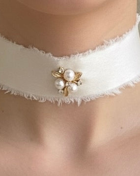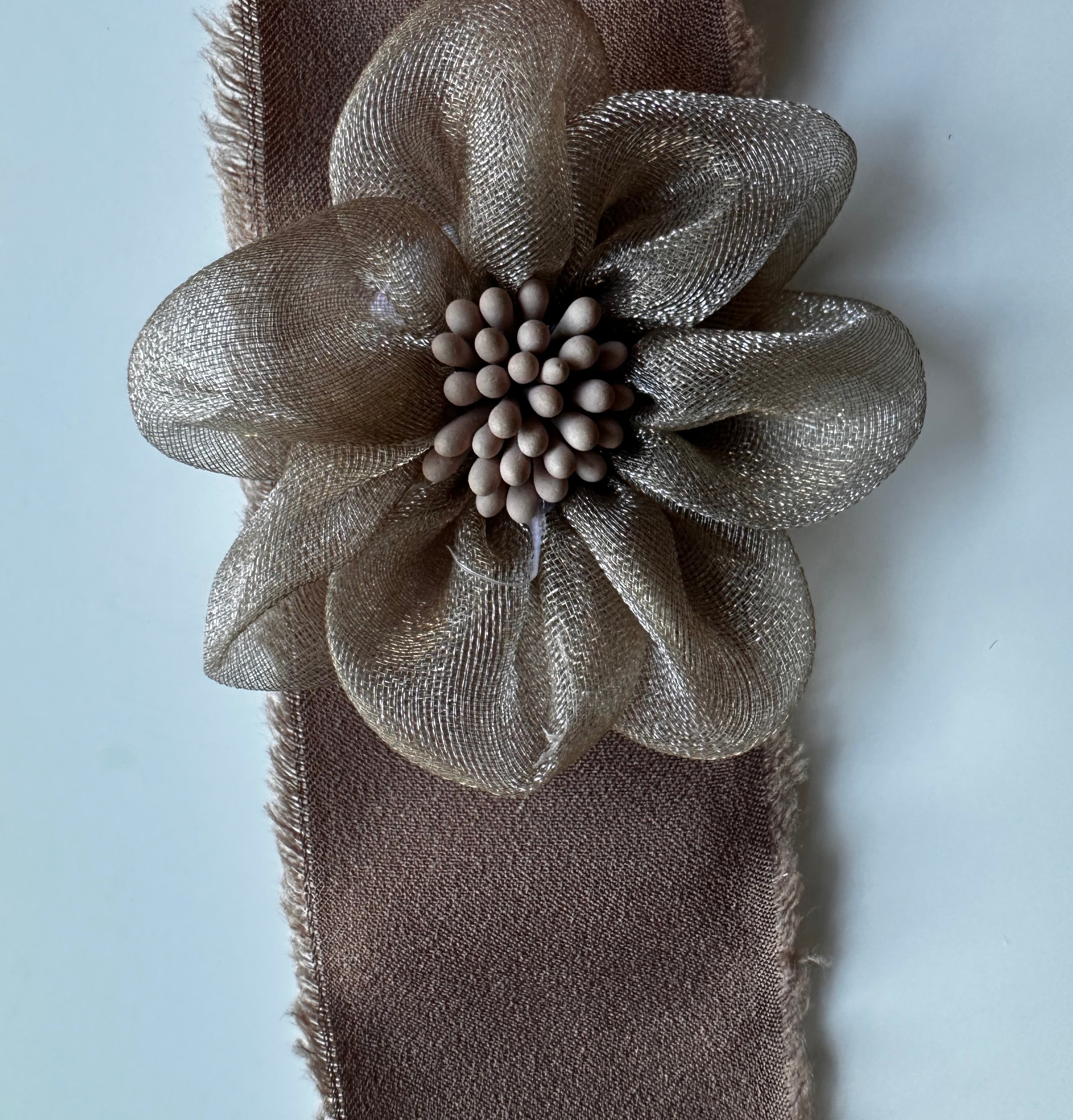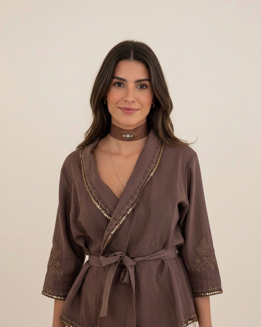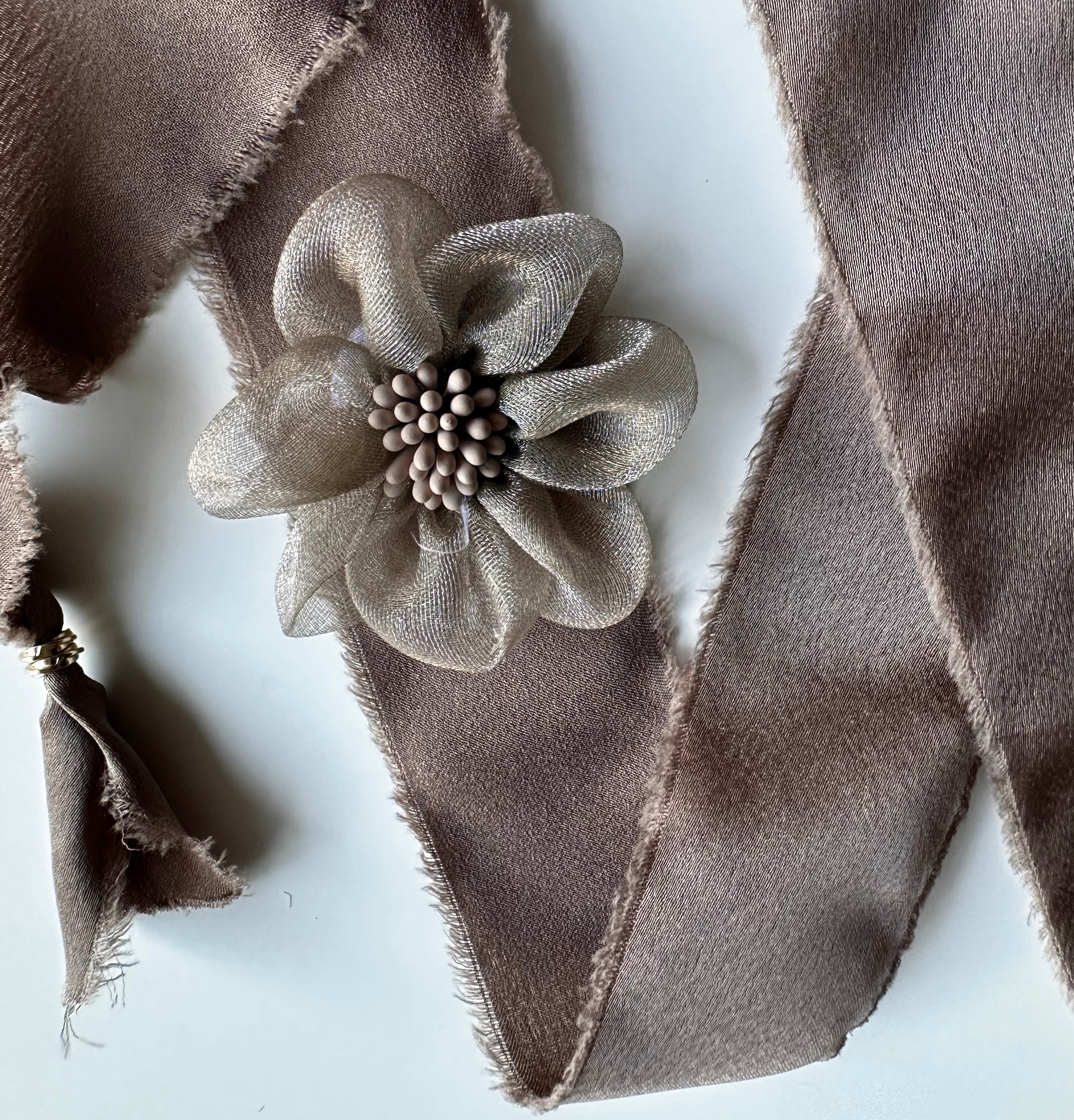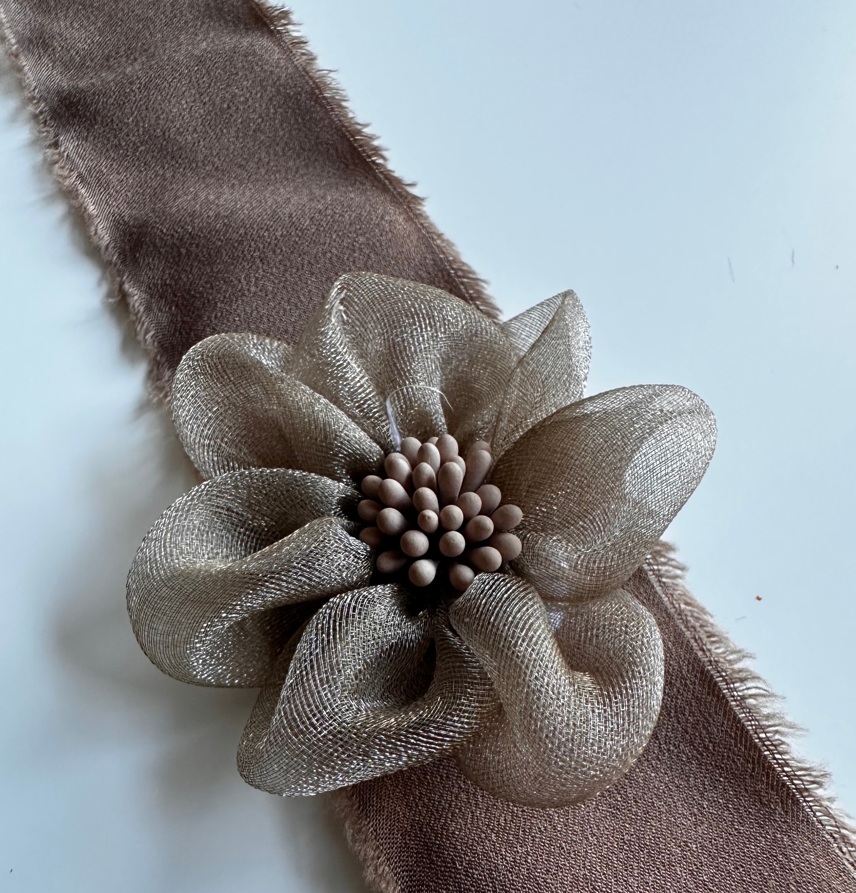 Choker confeccionado en tela de raso marrón, con un cierre dorado en ambas puntas y una estrella de estilo vintage cosida en el centro.