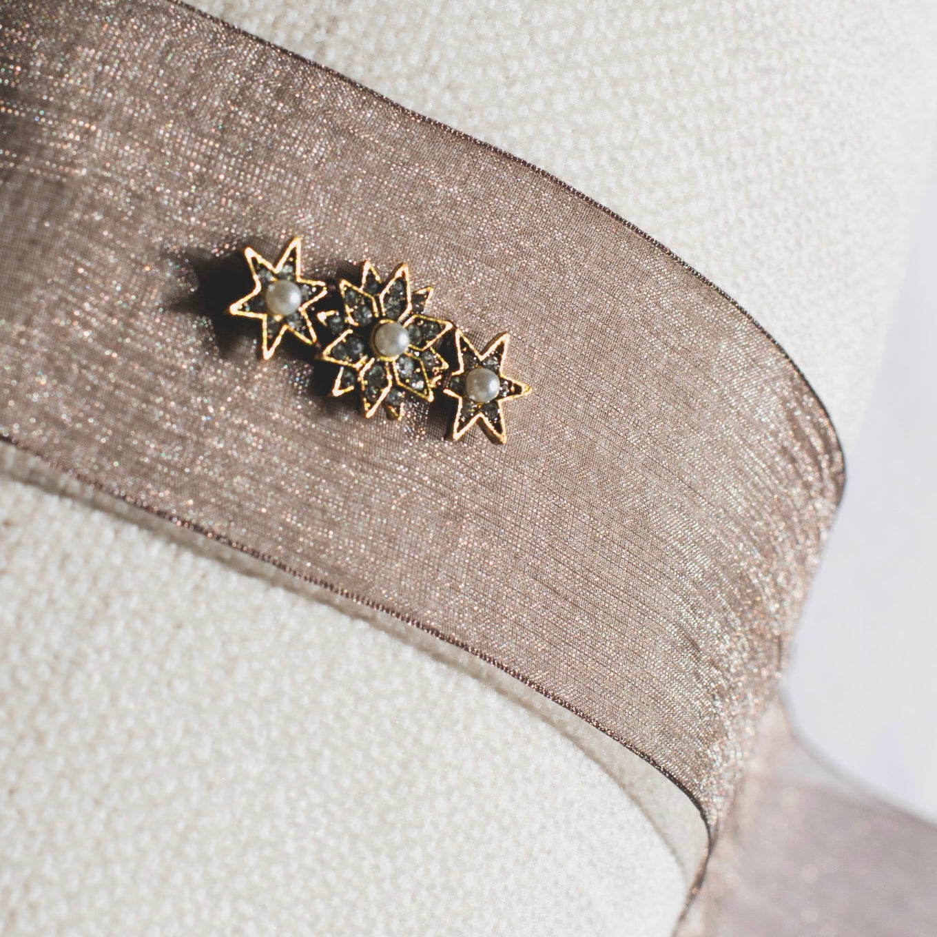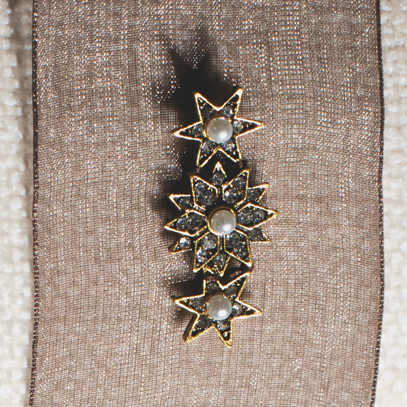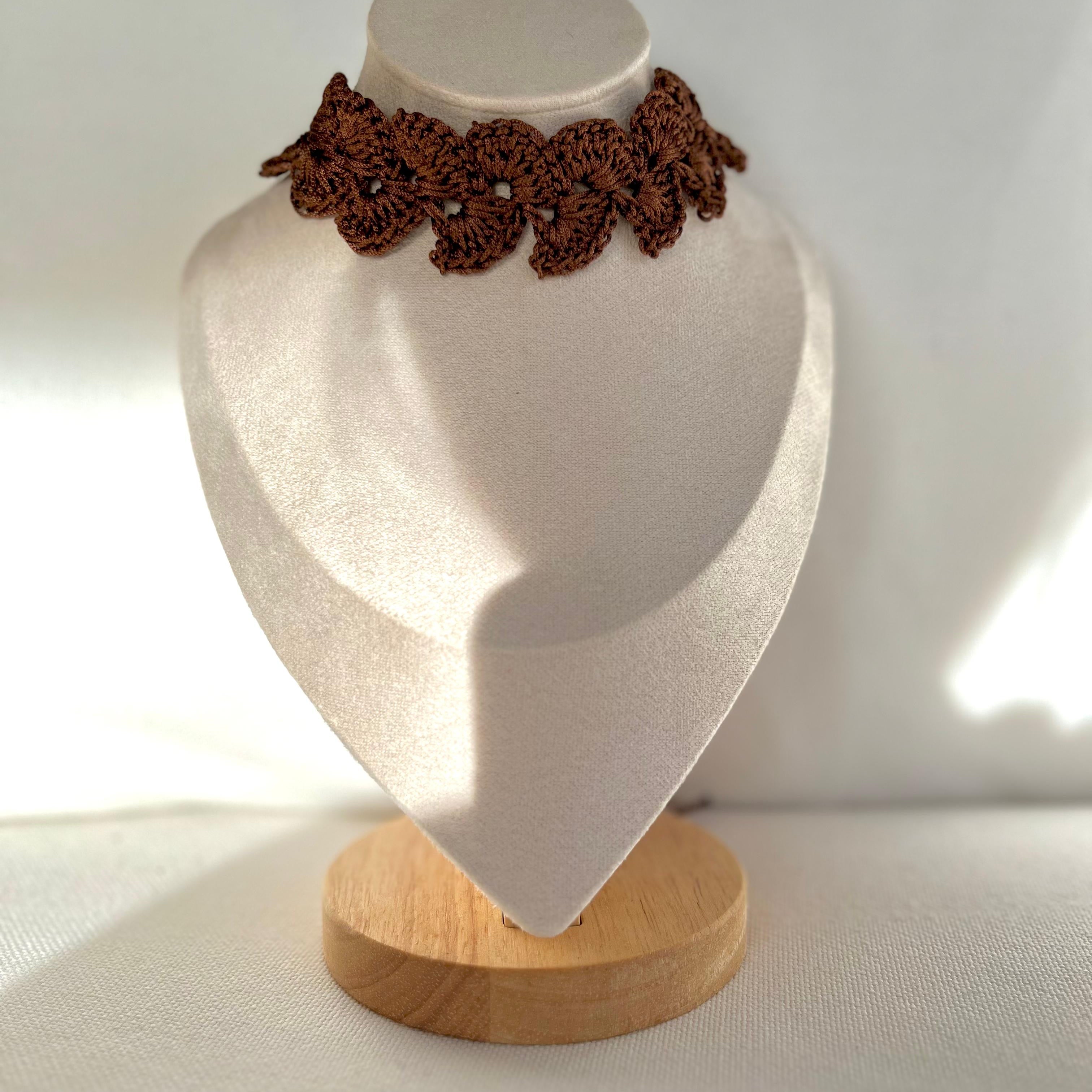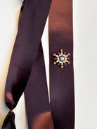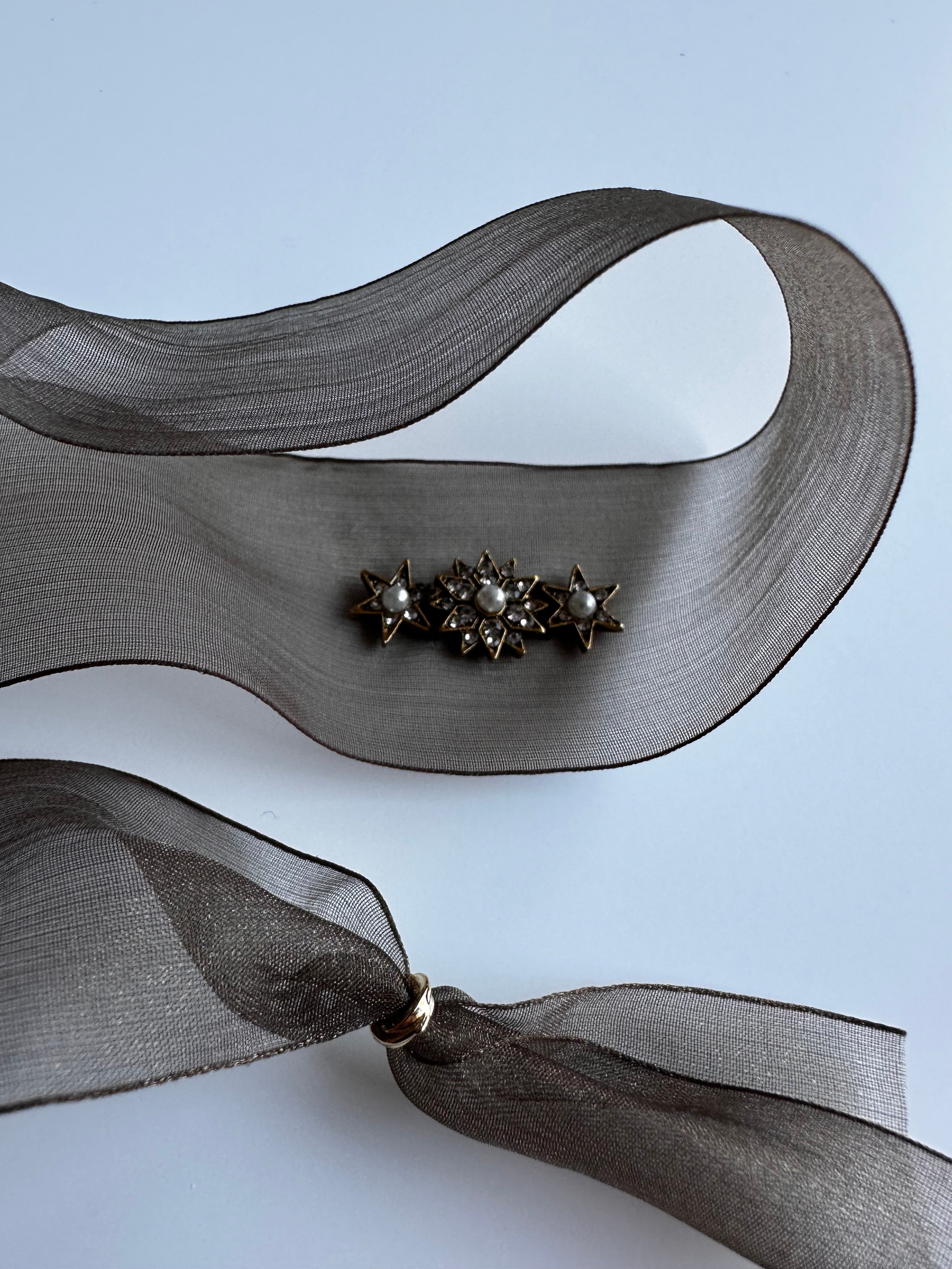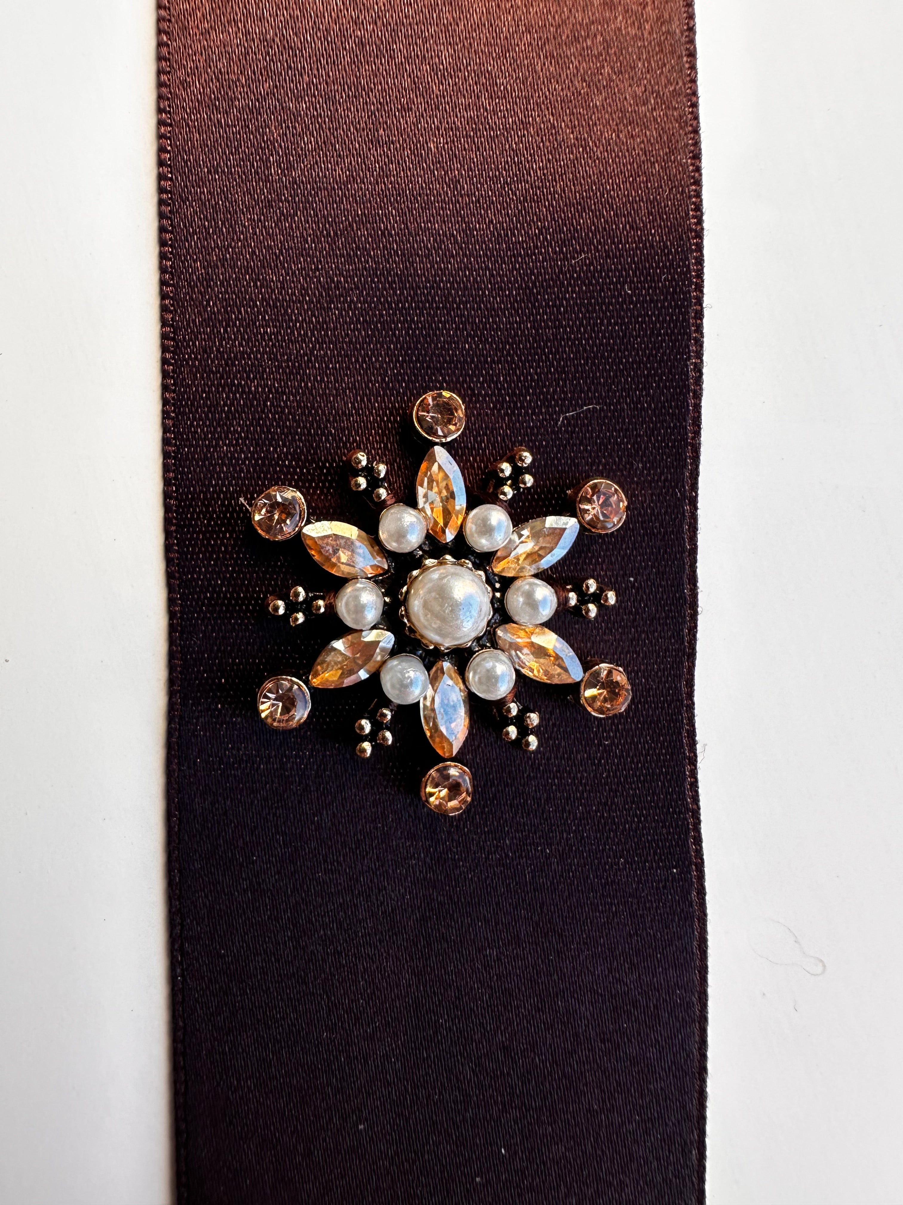 Choker confeccionado en tela de raso marrón, con un cierre dorado en ambas puntas y una estrella de estilo vintage cosida en el centro.