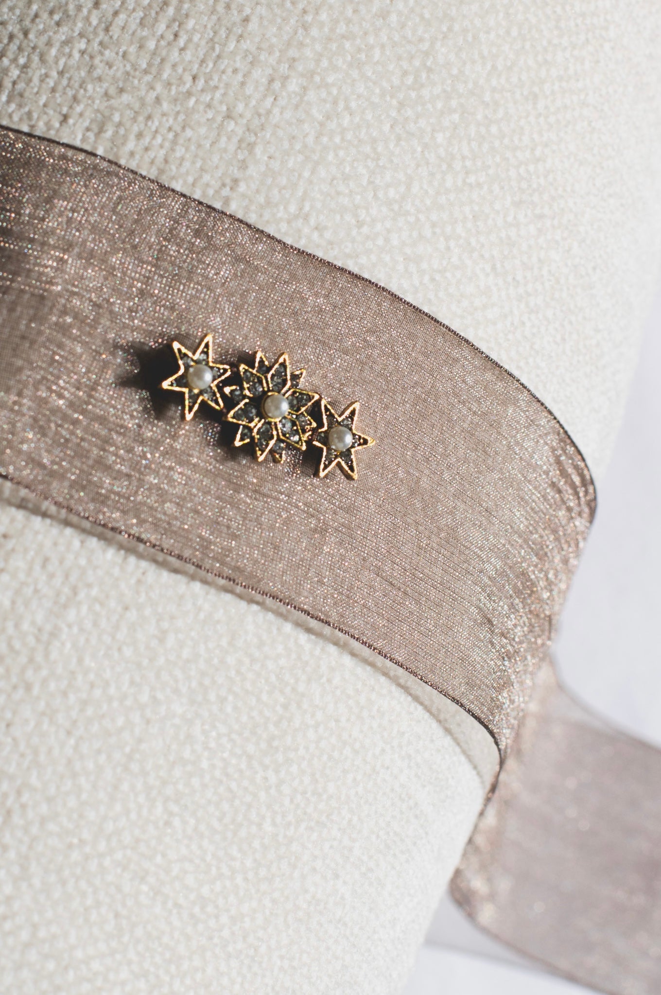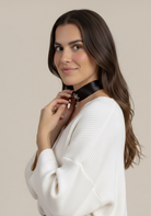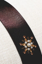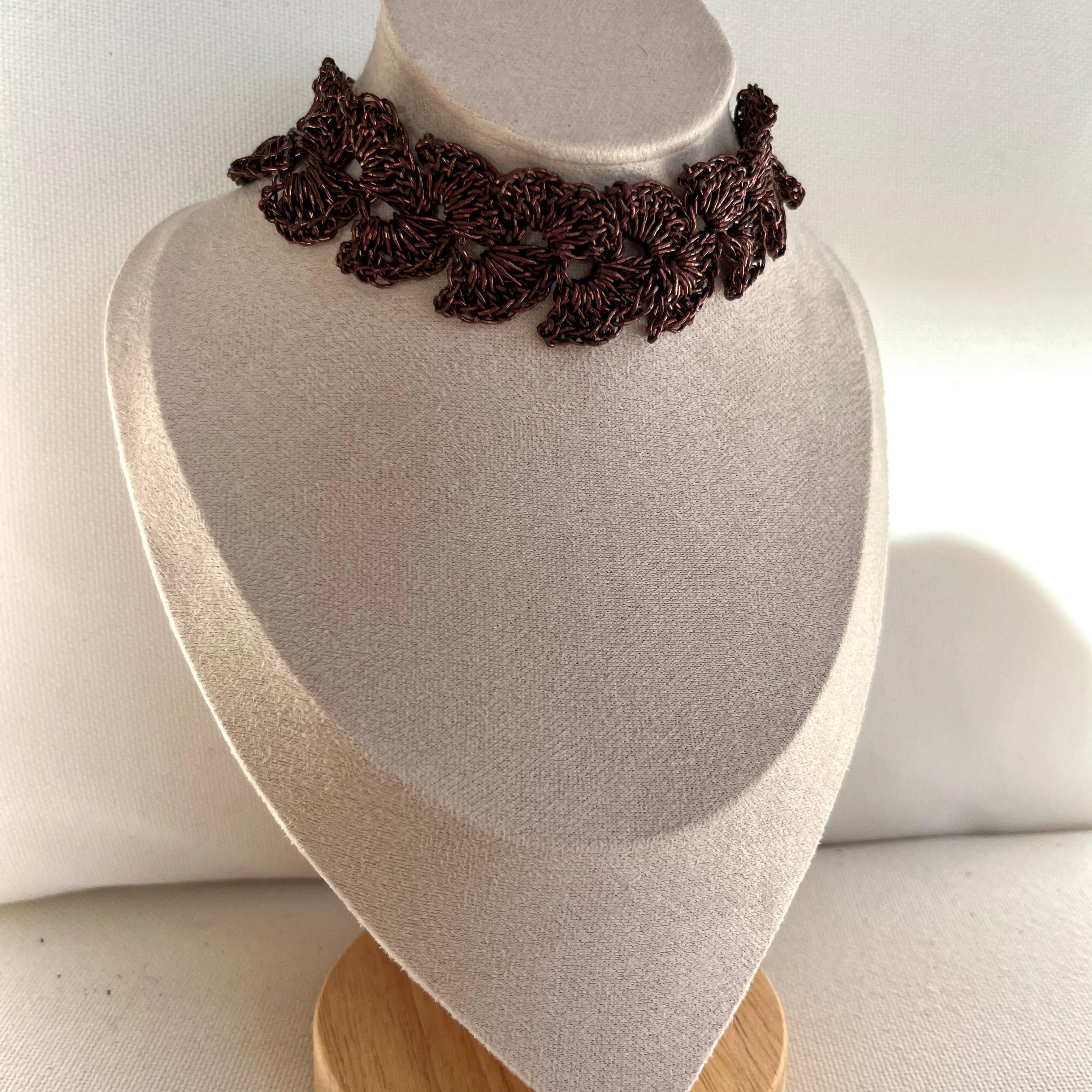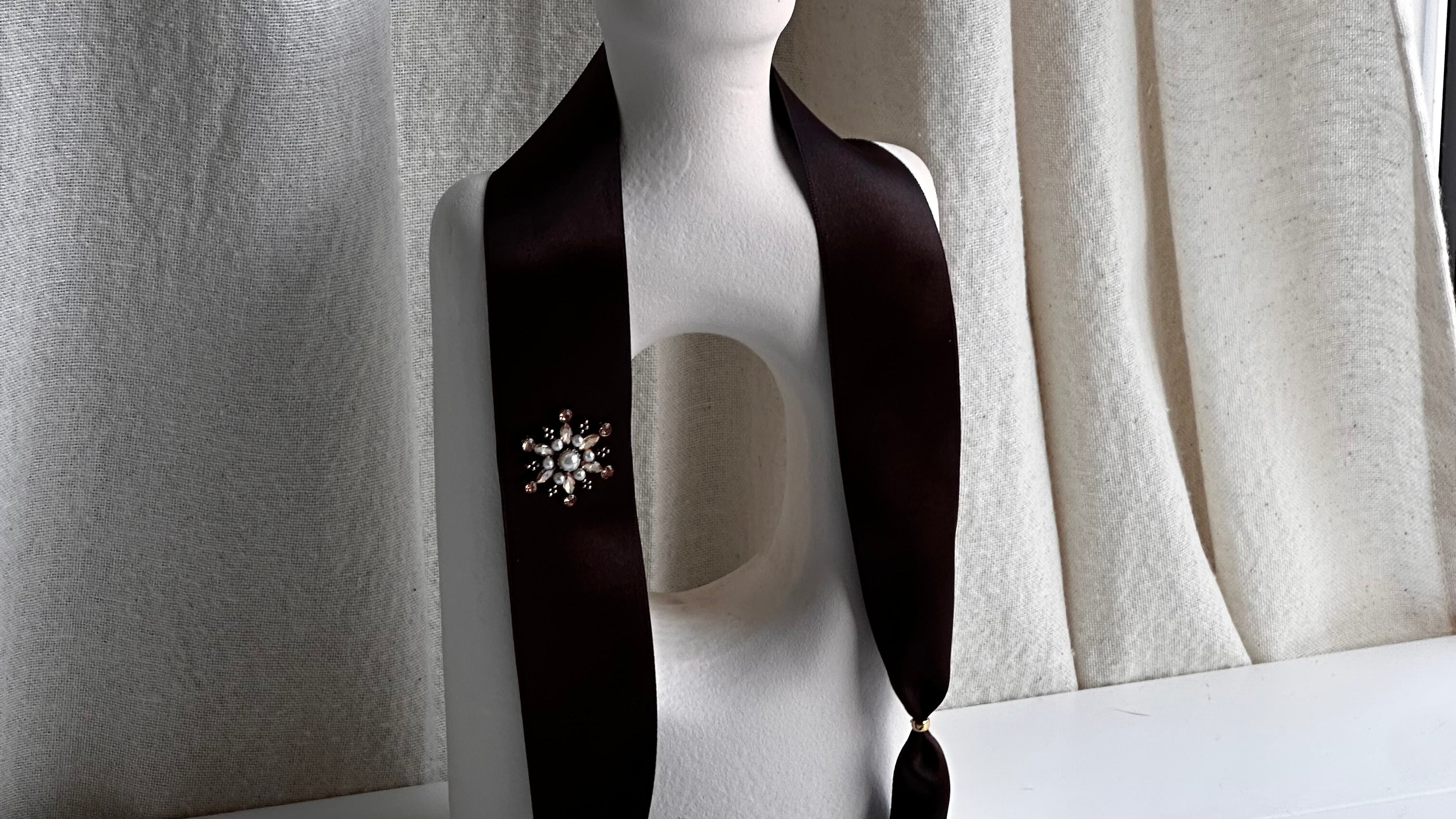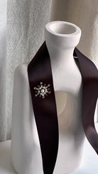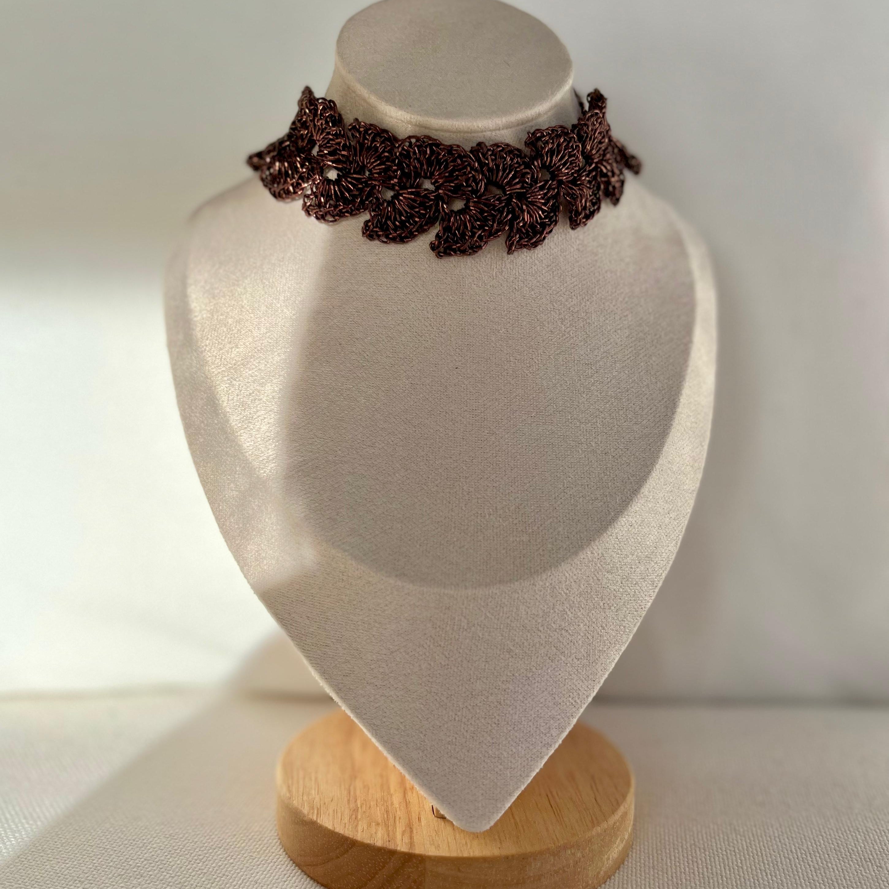 Choker confeccionado en tela de raso marrón, con un cierre dorado en ambas puntas y una estrella de estilo vintage cosida en el centro.