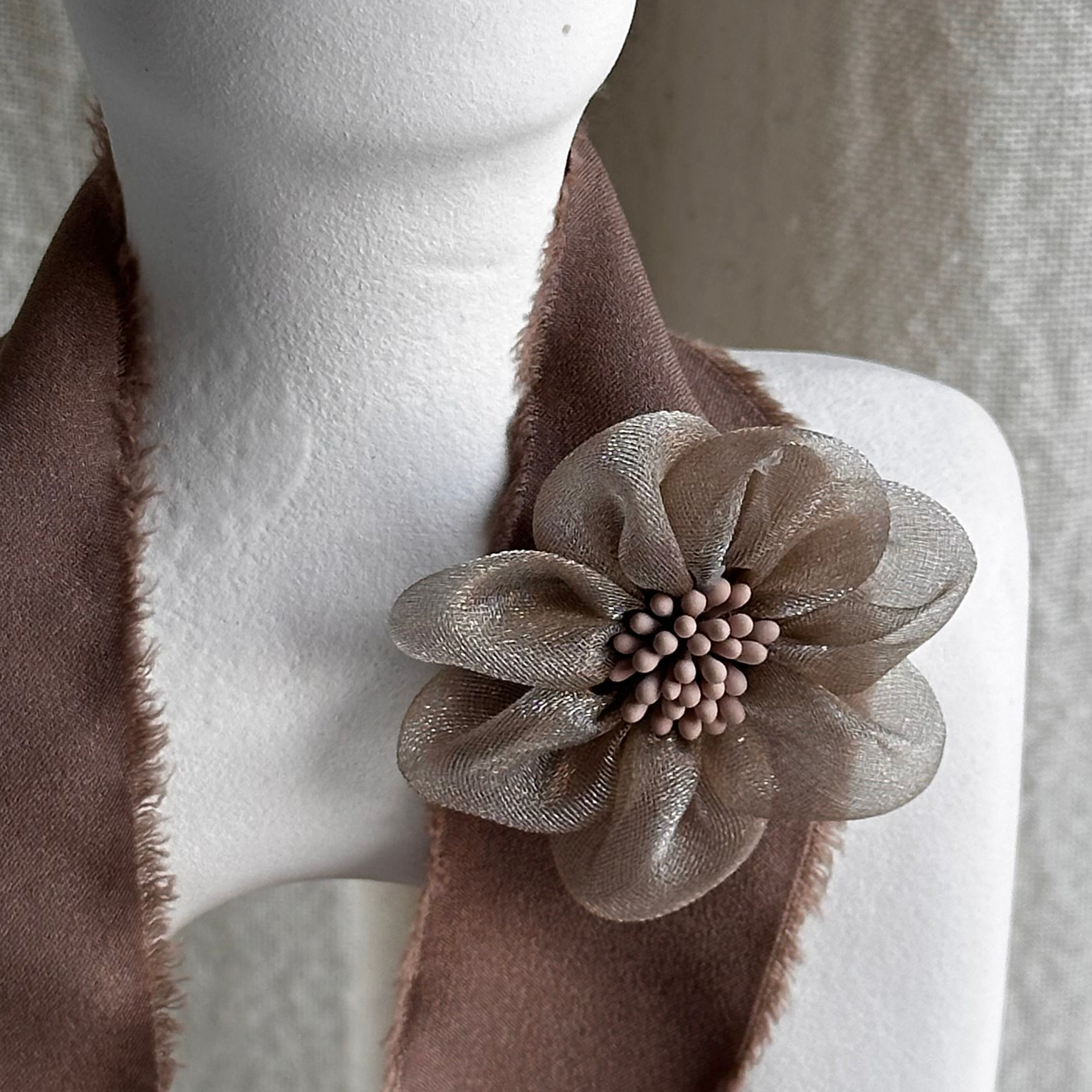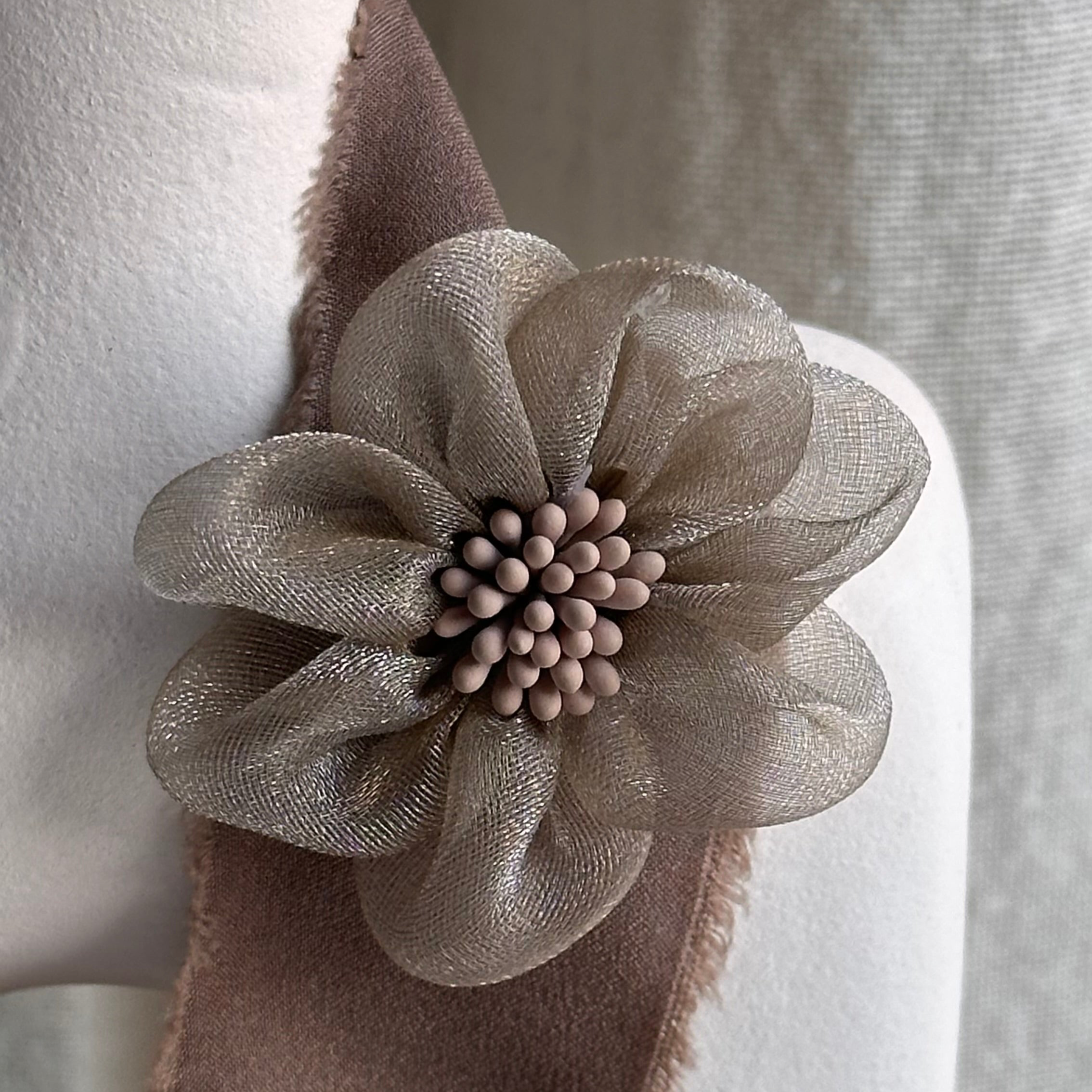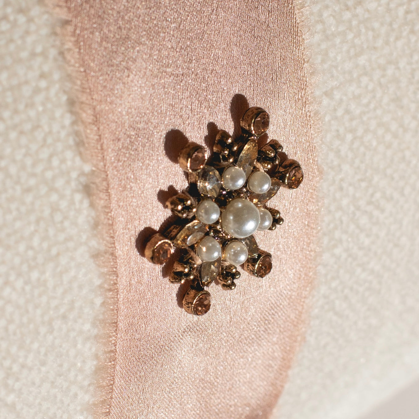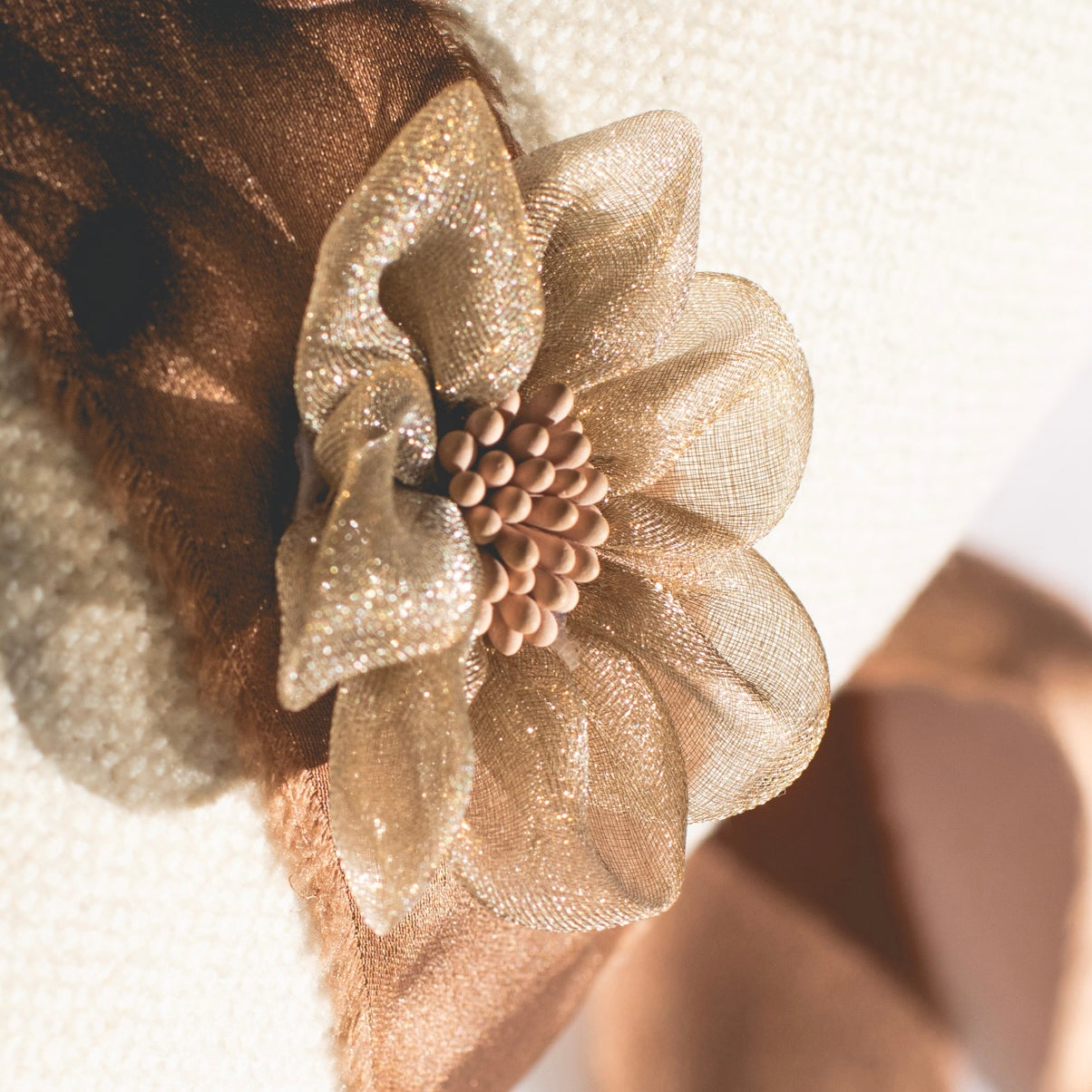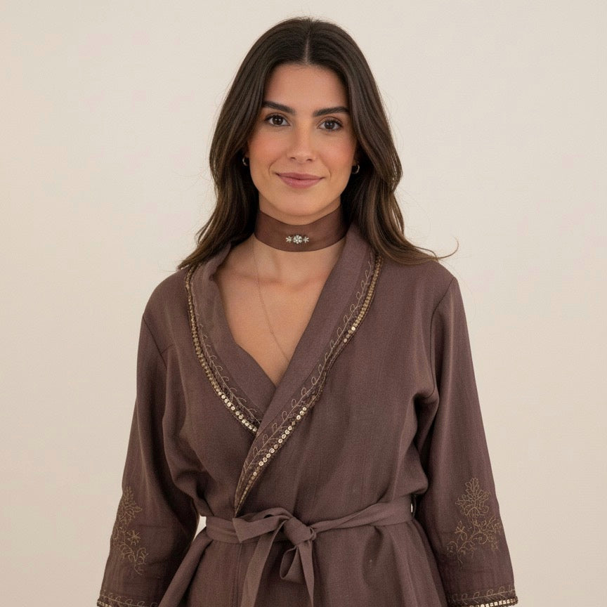 Choker confeccionado en tela de raso marrón, con un cierre dorado en ambas puntas y una estrella de estilo vintage cosida en el centro.