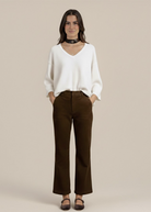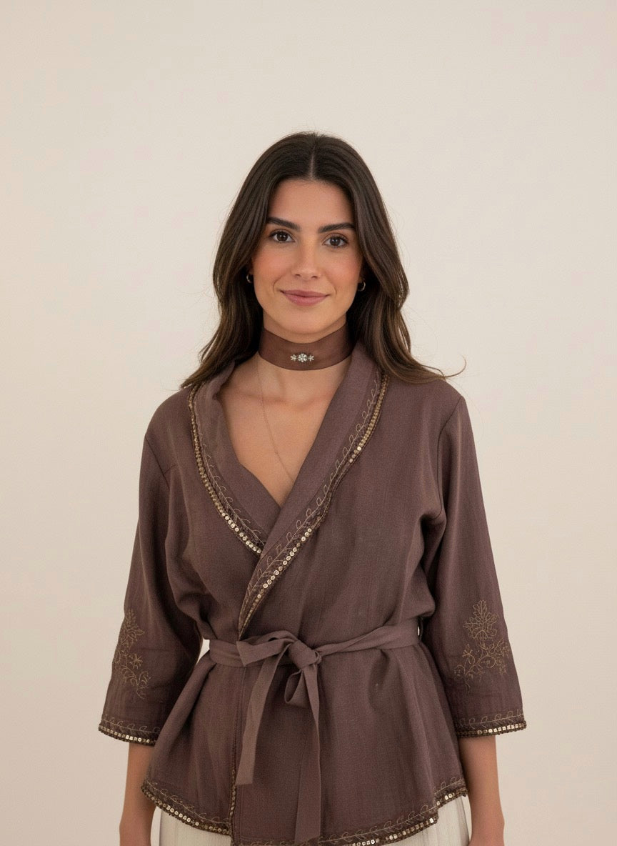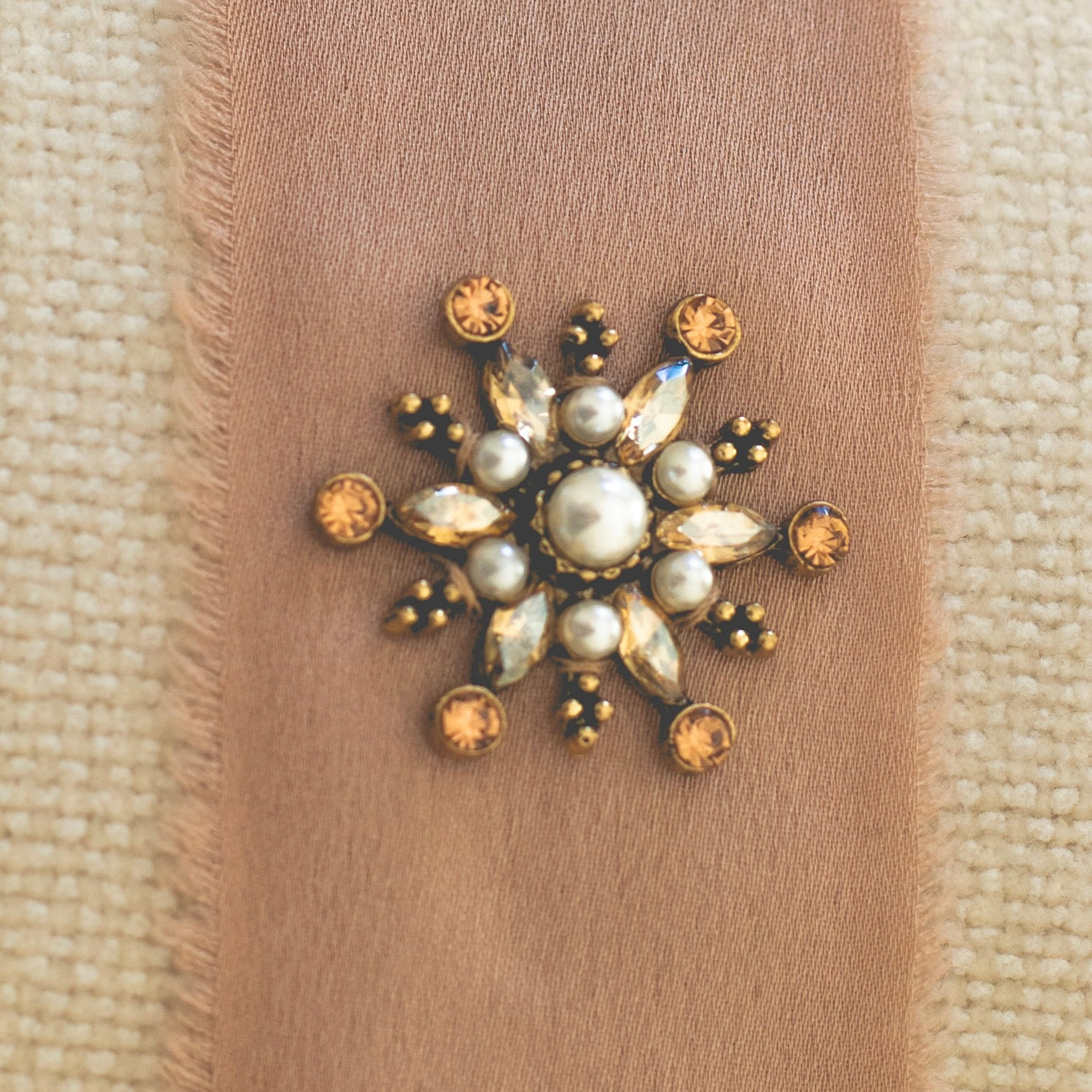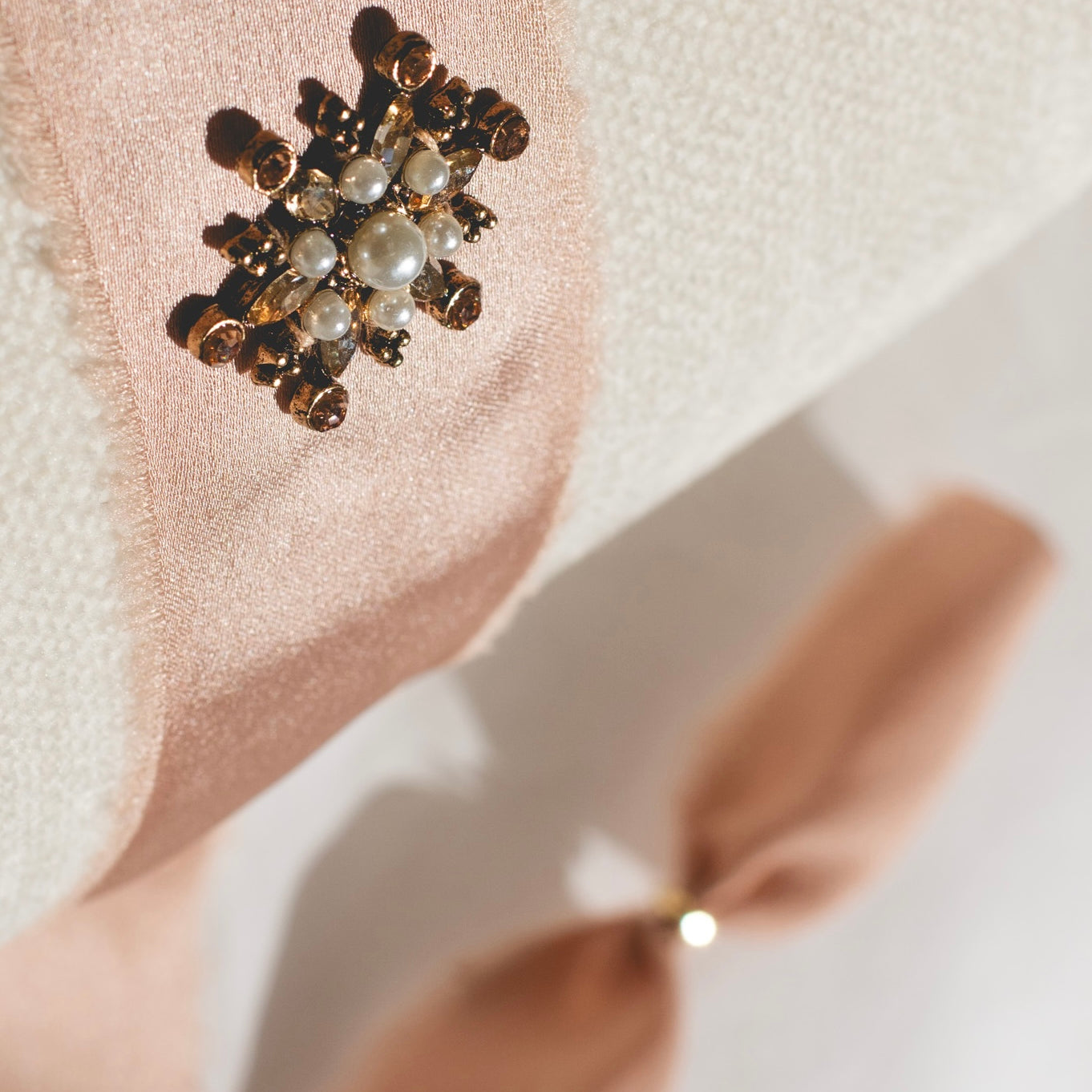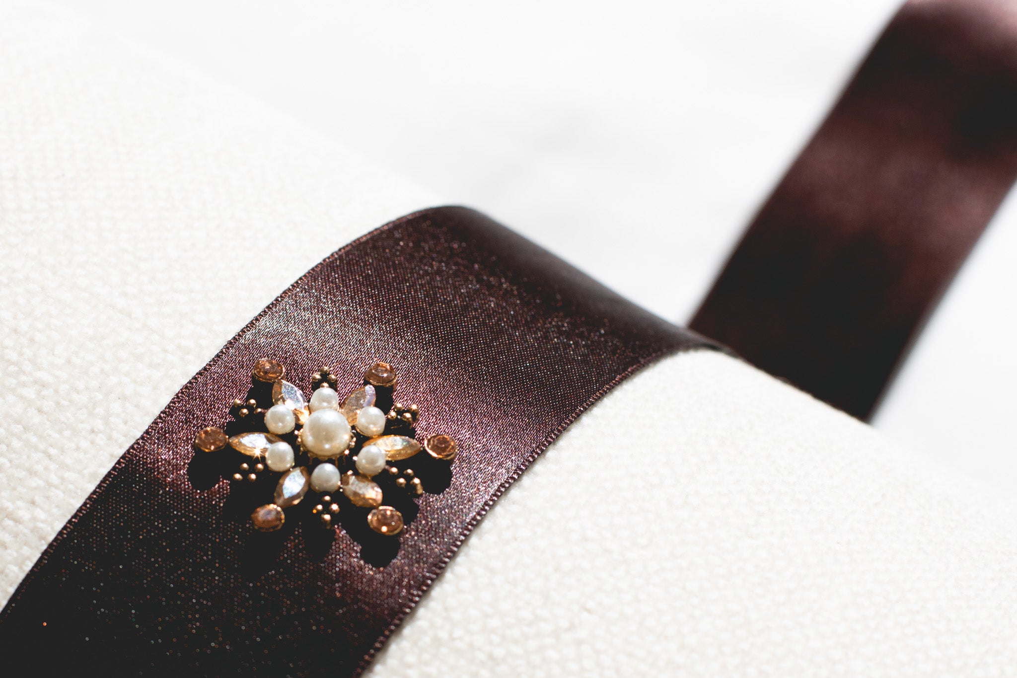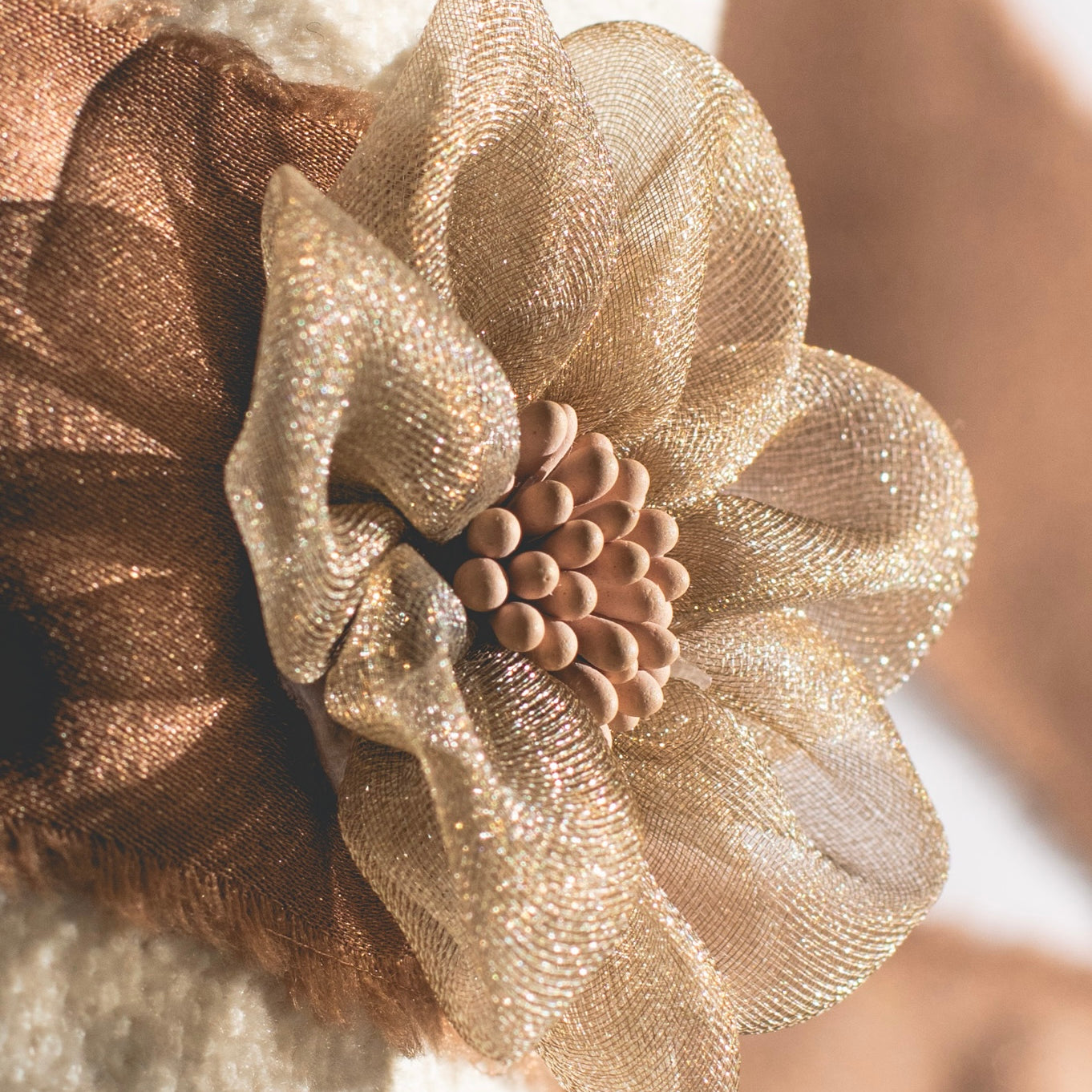 Choker confeccionado en tela de raso marrón, con un cierre dorado en ambas puntas y una estrella de estilo vintage cosida en el centro.