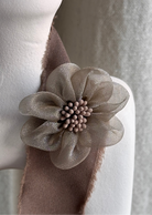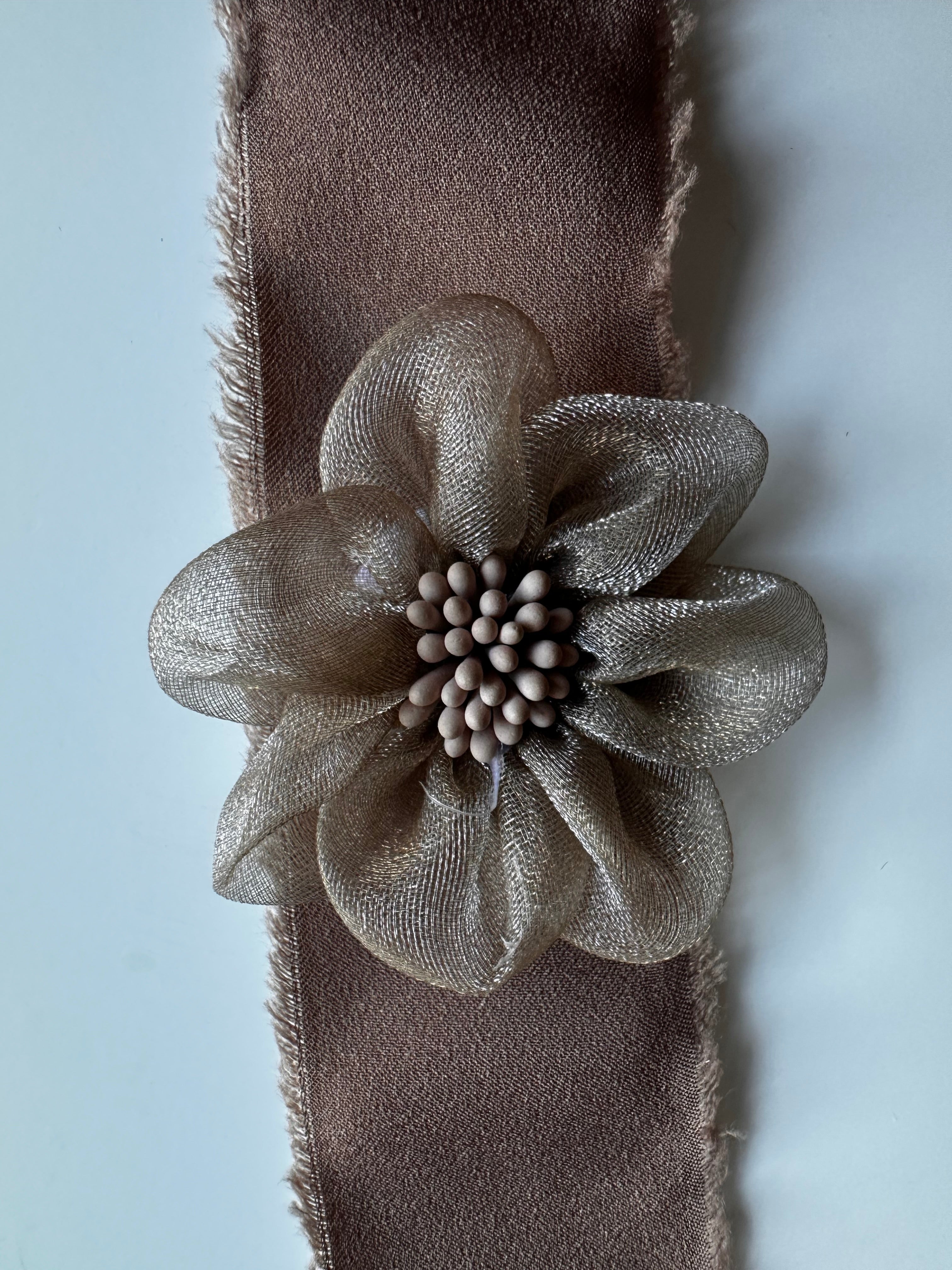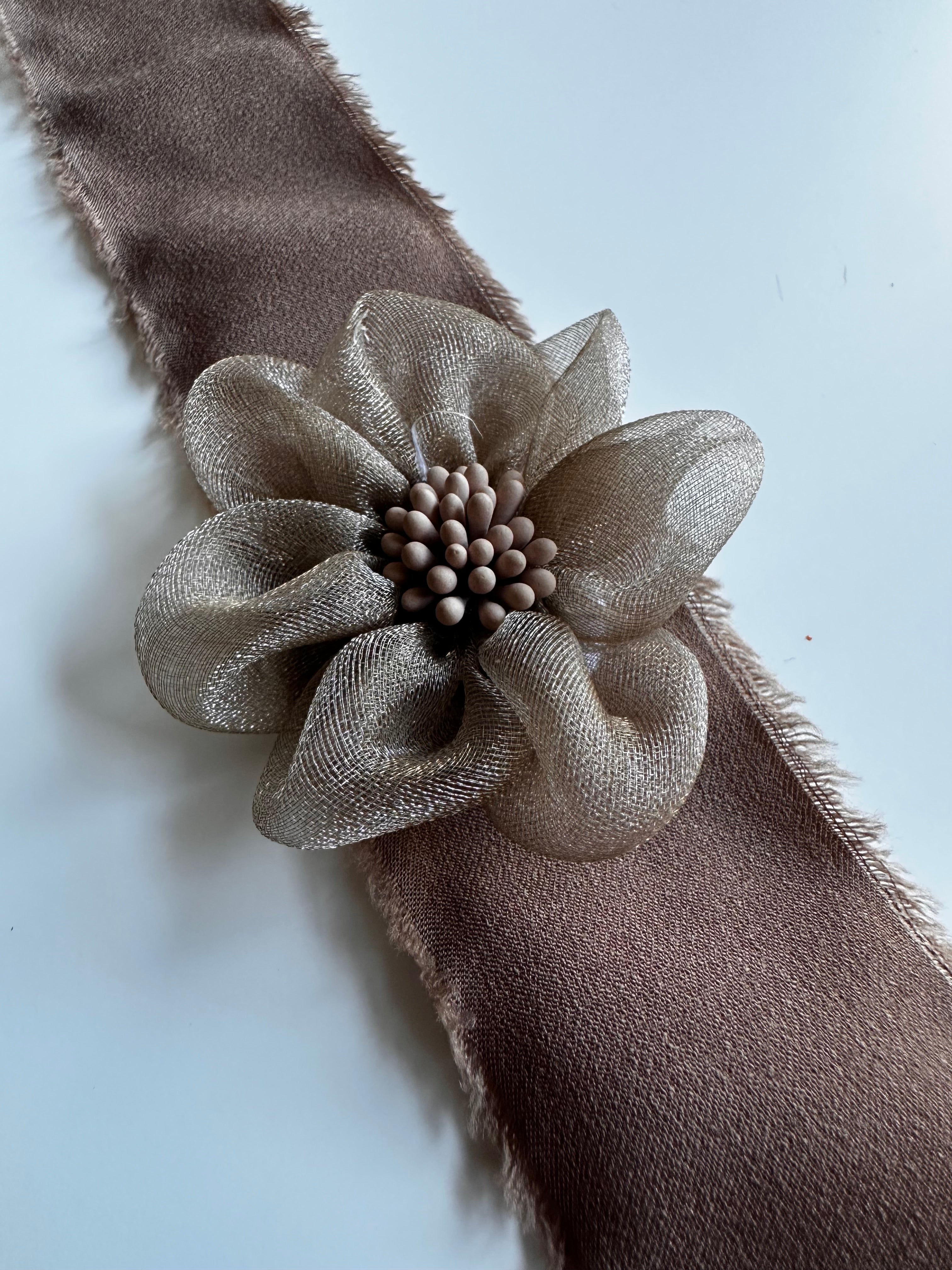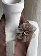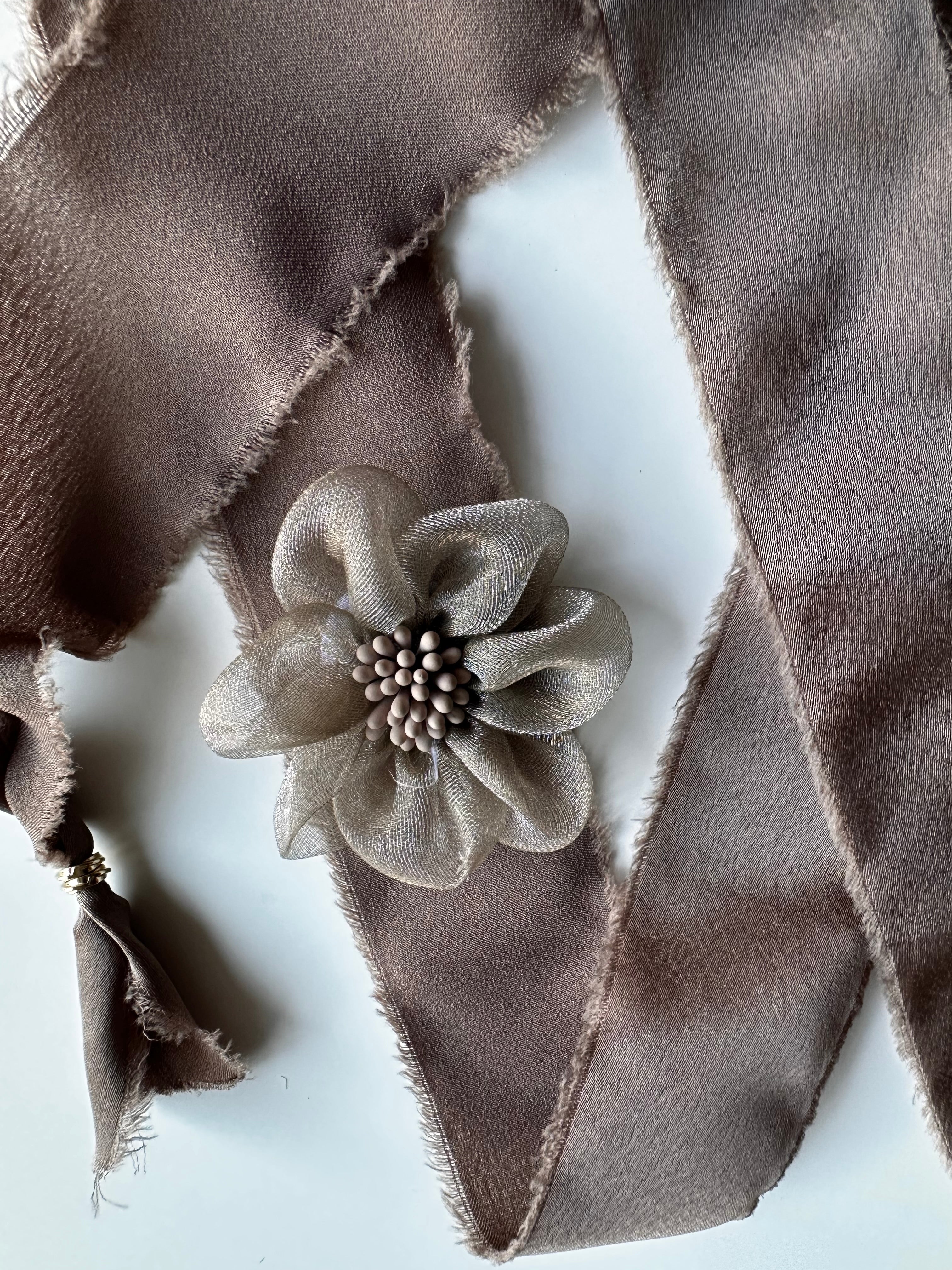 Choker elaborado en tela de satén en tono marrón café, con una delicada flor cosida en el centro. Acabado con cierres dorados en los extremos, puedes llevarlo corto o más largo. Perfecto tanto para ocasiones especiales como para darle un toque elegante a un look casual.