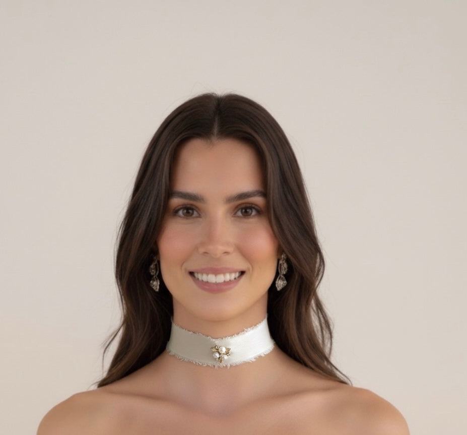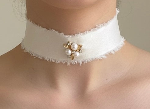 Choker elaborado en tela de satén en tono blanco crudo, con una delicada flor cosida en el centro.