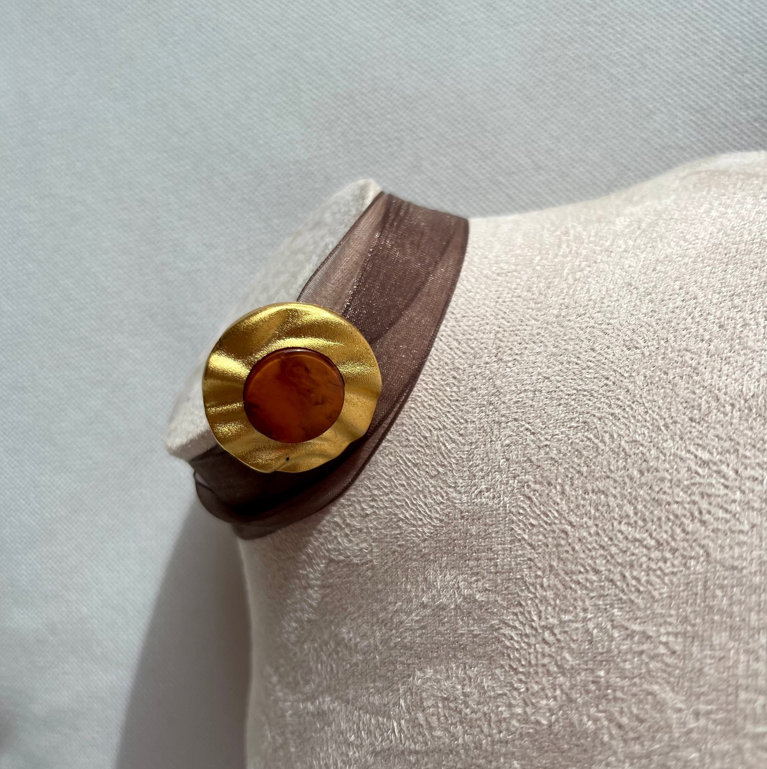 Choker de tela de organza en tono marrón, con un botón en el centro. La tela es lo suficientemente larga para que le puedas dar dos vueltas.